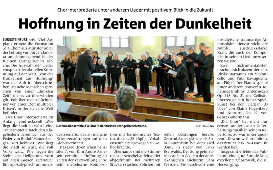 Jürgen Janotta leitete das ausgewählte Programm mit Werken von u.a. Arnesen, Brahms, Ešenvalds, Franck, Hagenberg, Hatch und Mauersberger, die sich auf unterschiedliche Weise dem Thema Hoffnungslosigkeit entgegenstellten.